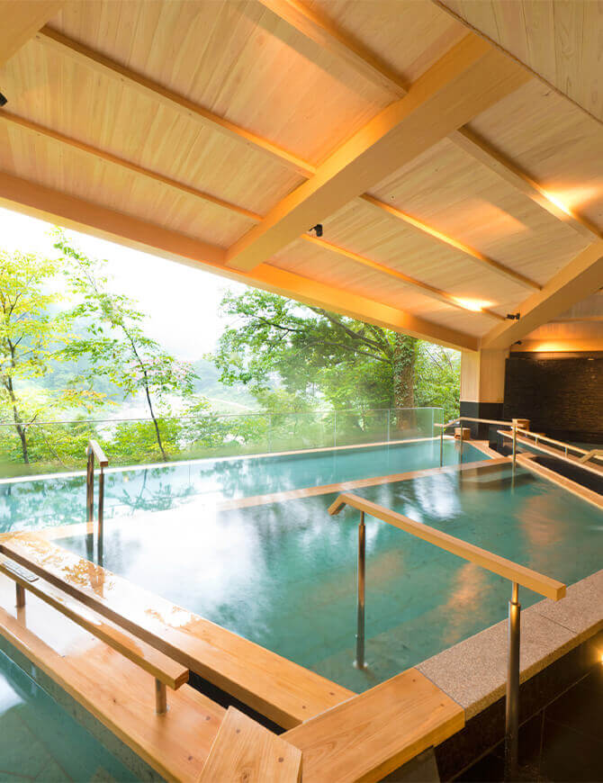 湯量豊富な宇奈月温泉。大きな浴槽にたっぷりと湯を湛えた湯船につかり四季折々の眺めを臨む至福。「つべつべ」美肌の湯で心身ともにリラックスください。