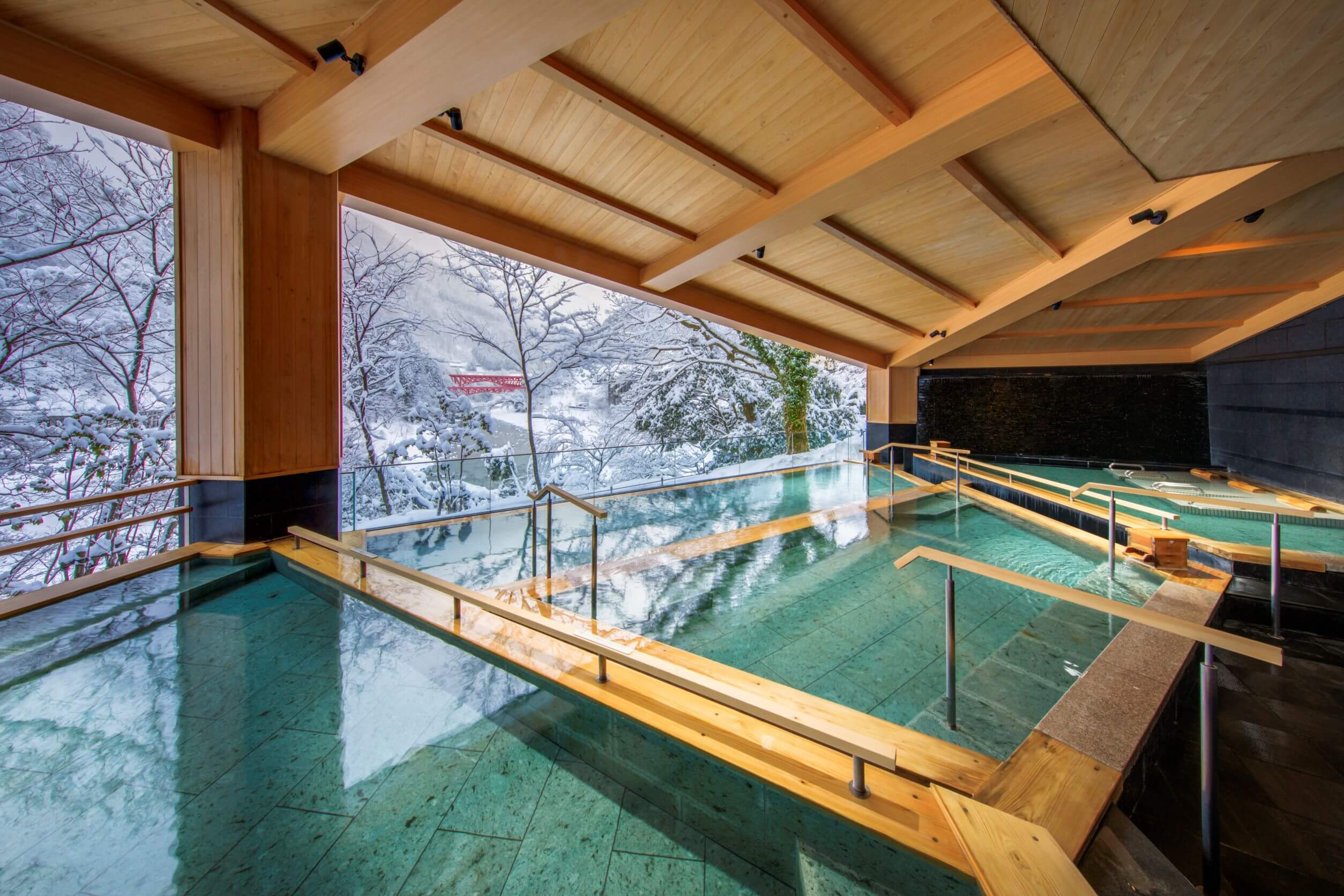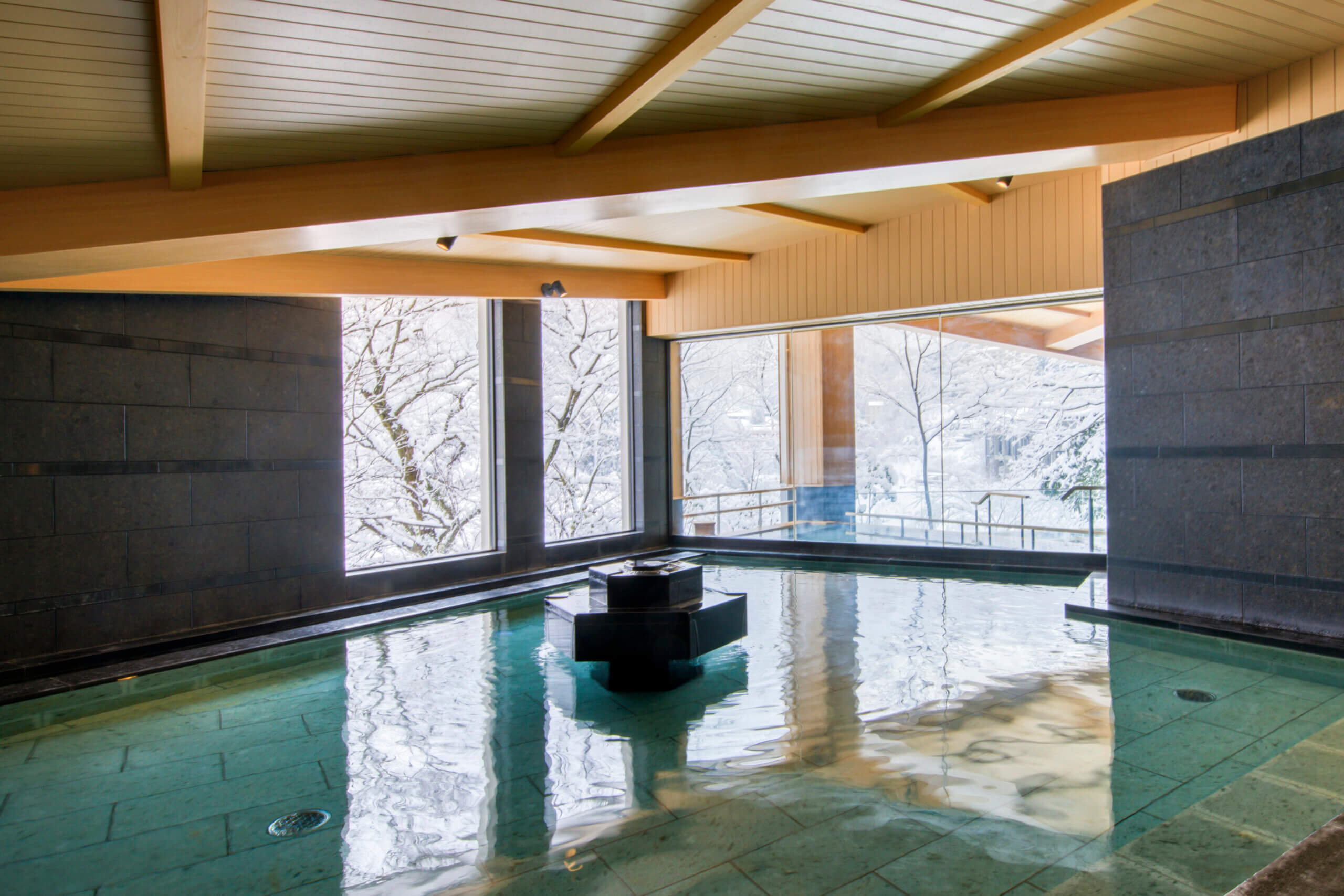 湯量豊富な宇奈月温泉。大きな浴槽にたっぷりと湯を湛えた湯船につかり四季折々の眺めを臨む至福。「つべつべ」美肌の湯で心身ともにリラックスください。