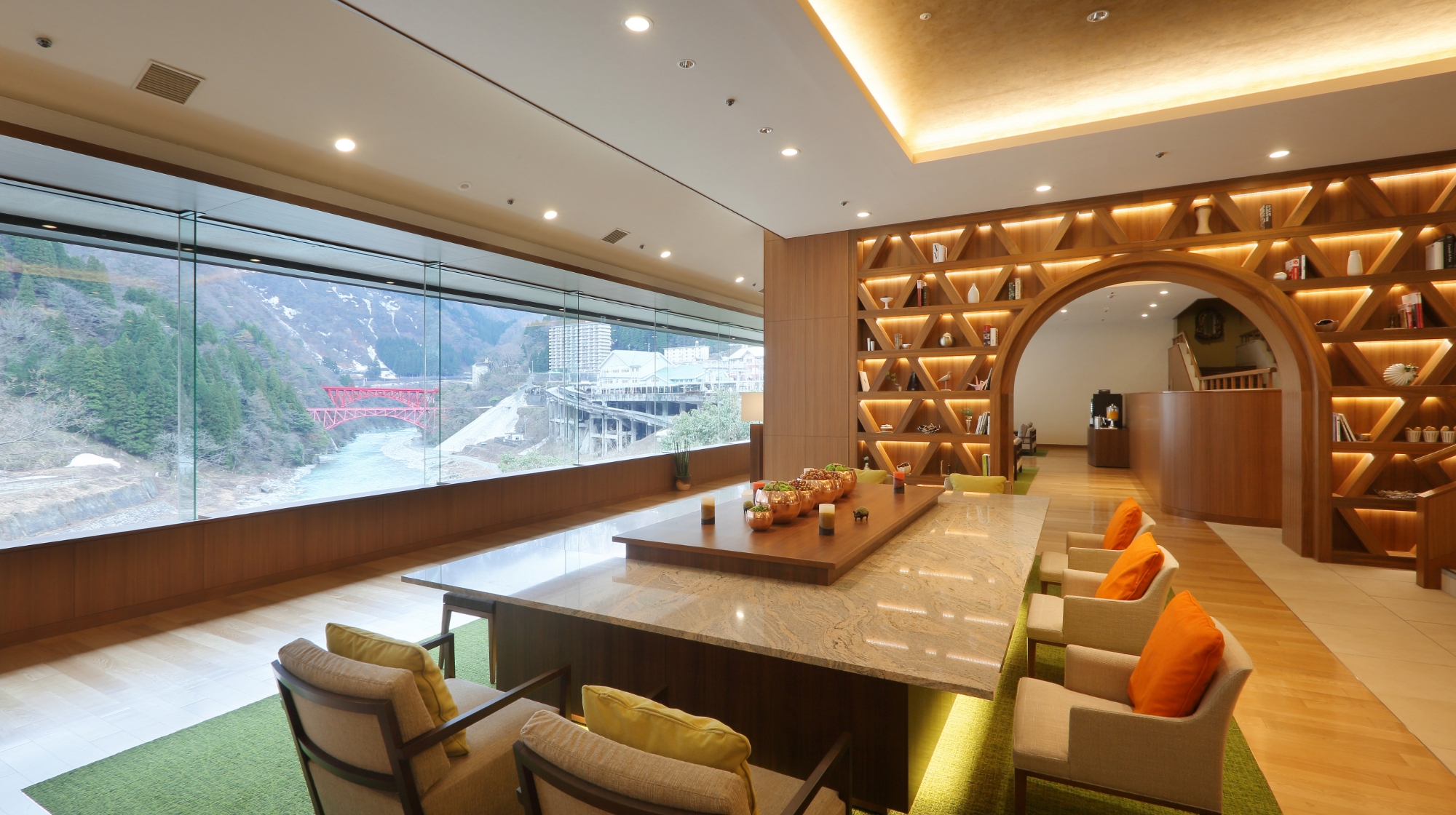 チェックイン後、お部屋への入室前にラウンジから臨む黒部・宇奈月の雄大な大自然を無料のコーヒなどをお飲みいただきながらお愉しみください。